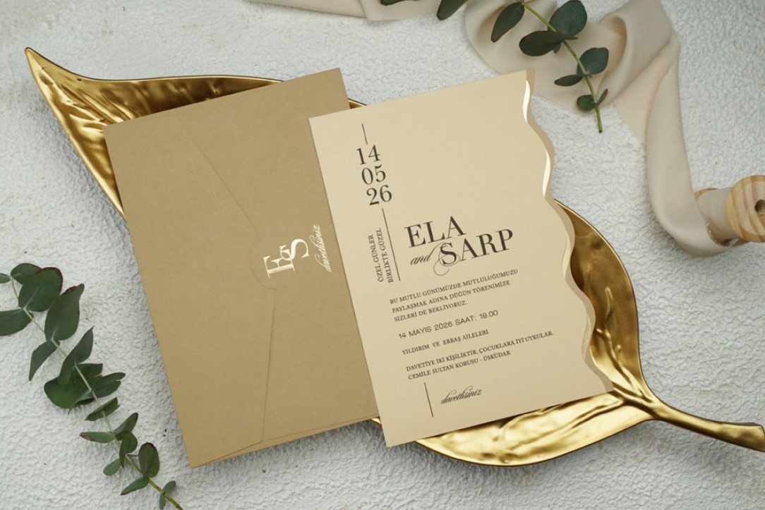 Screenshot_47Doğallığı lüks detaylarla harmanlayan, ezber bozan bir şıklık arayan çiftler için tasarlanan bu özel model, geometrik netliği romantik kıvrımlarla buluşturuyor. Ela and Sarp çiftinin bu unutulmaz gününe eşlik eden tasarım, kraft tonlarının sıcaklığını altın varak detayların ışıltısıyla taçlandırarak misafirlerinize modern bir görsel şölen sunuyor.Tasarım Özellikleri ve Sanatsal Detaylar